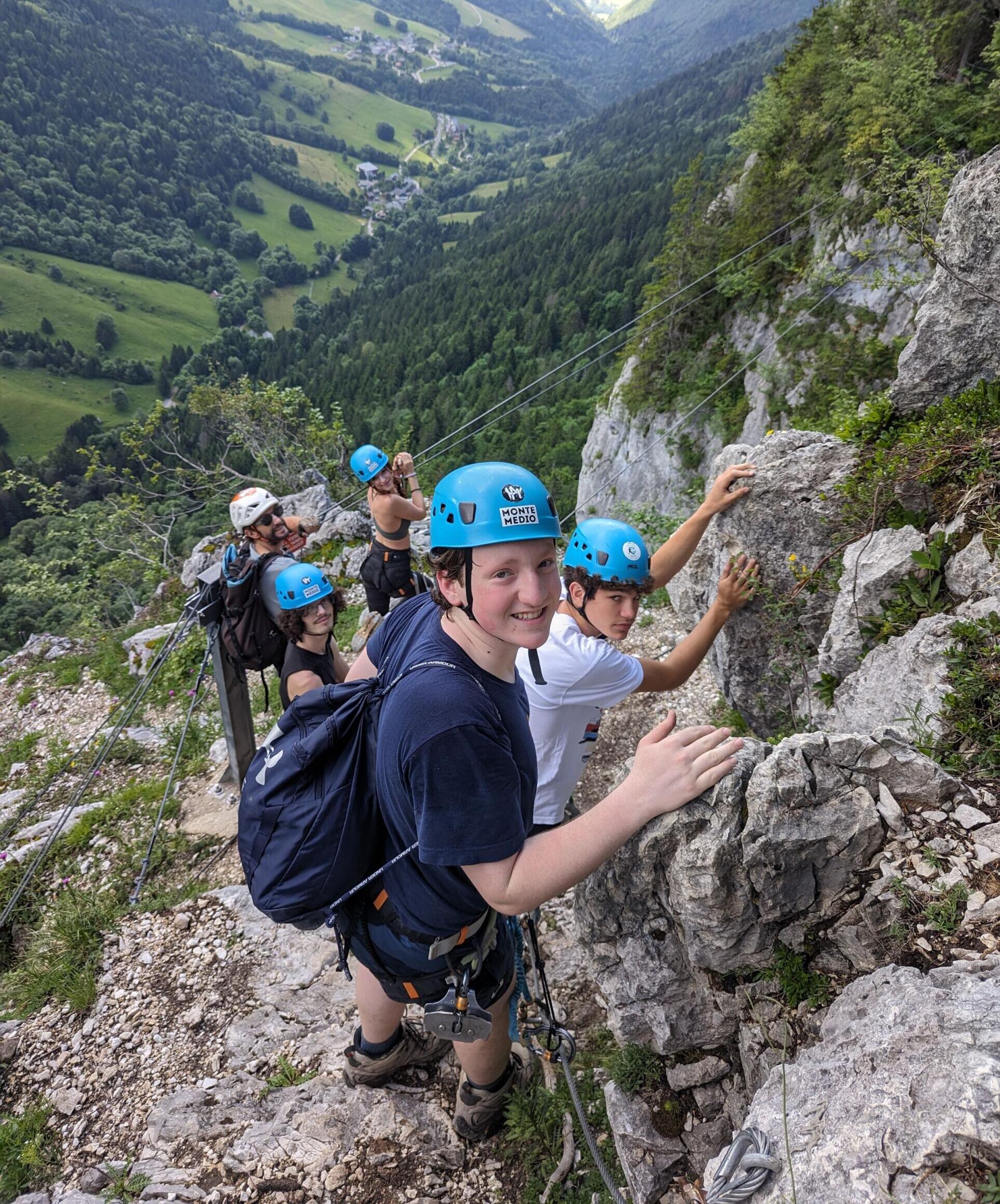 Adventurous teens rock climbing in the Alps
